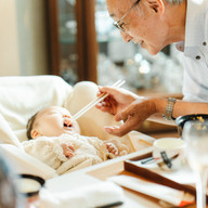 お食い初めはパパやおじいちゃんおばあちゃんがお世話をすることも多いイベント。ママの手が空いた瞬間にママ目線で赤ちゃんやご家族を撮ると思い出に残りますよ〜!